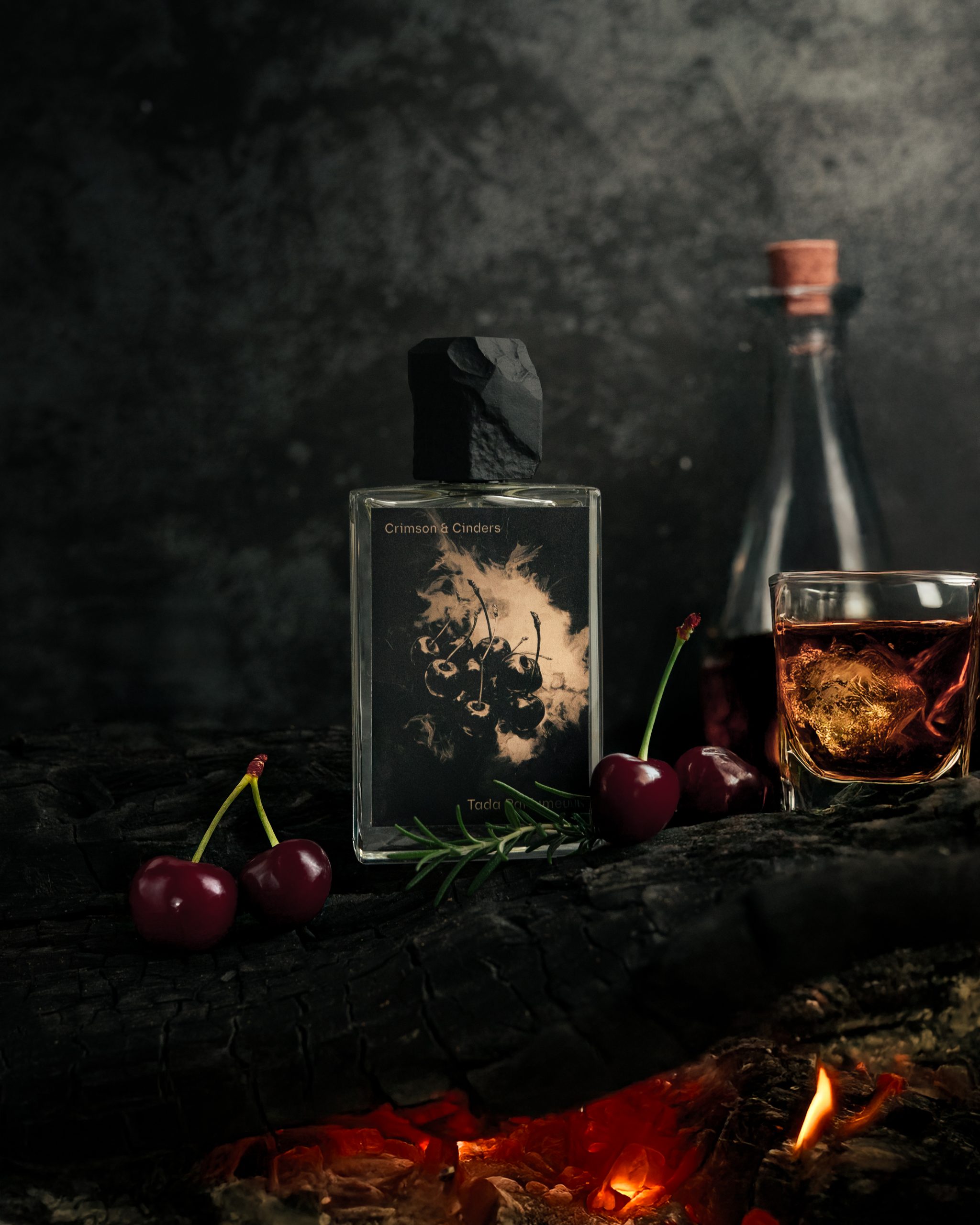 The fragrance opens with that very fire: cherry—ripe, sharp, defiant—wrapped in a haze of absinthe and smoke. The heart simmers with rosemary, rose, and a splash of rum, adding a twist of wild elegance. As it settles, a base of amber, cade, and clove bud glows like glowing embers—warm, smoky, and unforgettable.