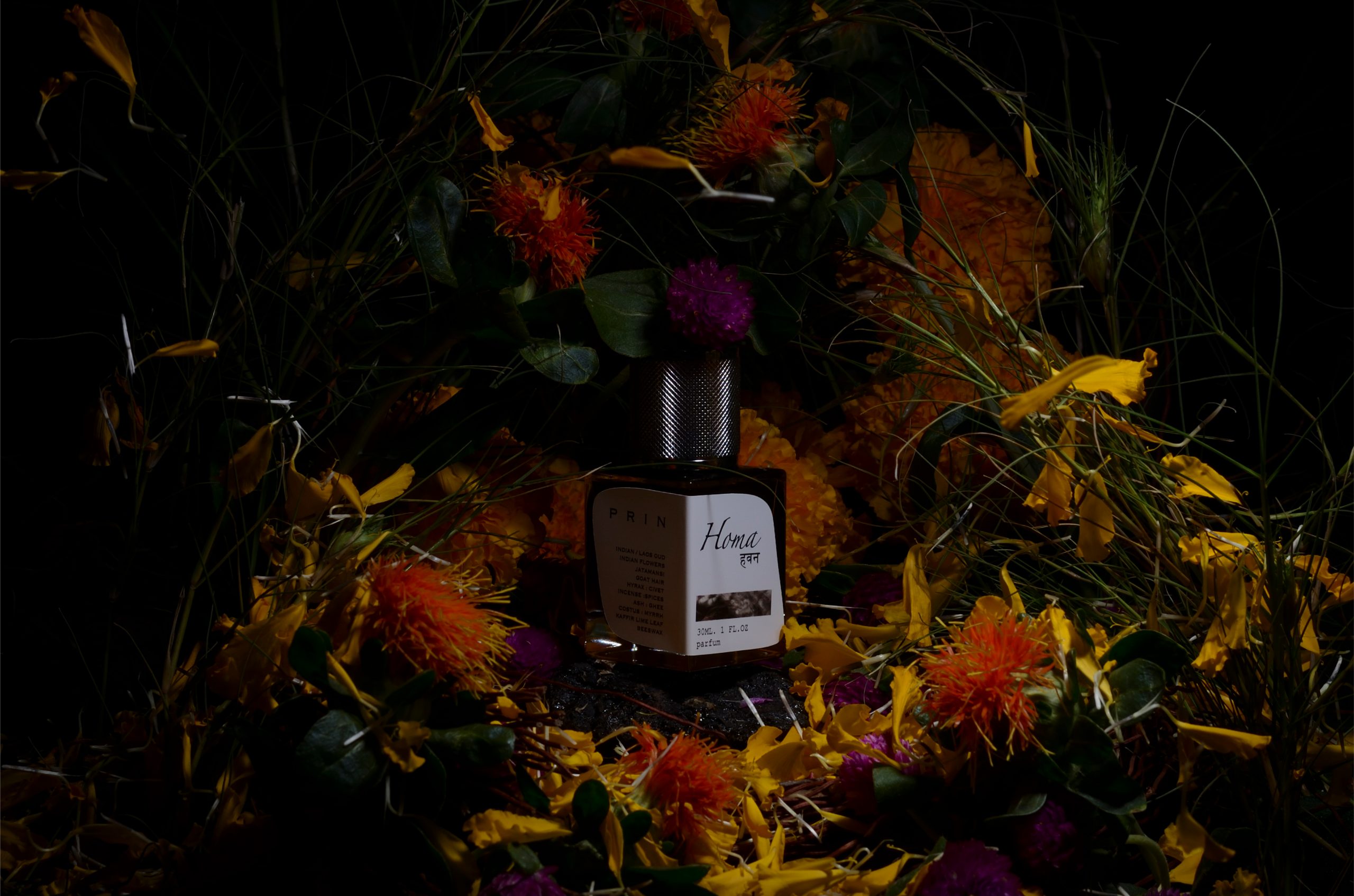 Our Homa (हवन) perfume is a combination of natural materials and substances that are sometimes associated with fire ceremonies or rituals. For example, ghee (clarified butter) is commonly used as an offering in fire rituals. Various fragrant substances, such as spices, incense, jasmine absolute, Champaca, myrrh, and benzoin, are often used to create a pleasant aroma during the ceremony. While some items on the list, like Oud, Hay and beeswax are associated with spiritual practices and traditional rituals, others, such as mushrooms or animal-derived substances like civet and hyrax, are added for exotic and mysterious dimensions.